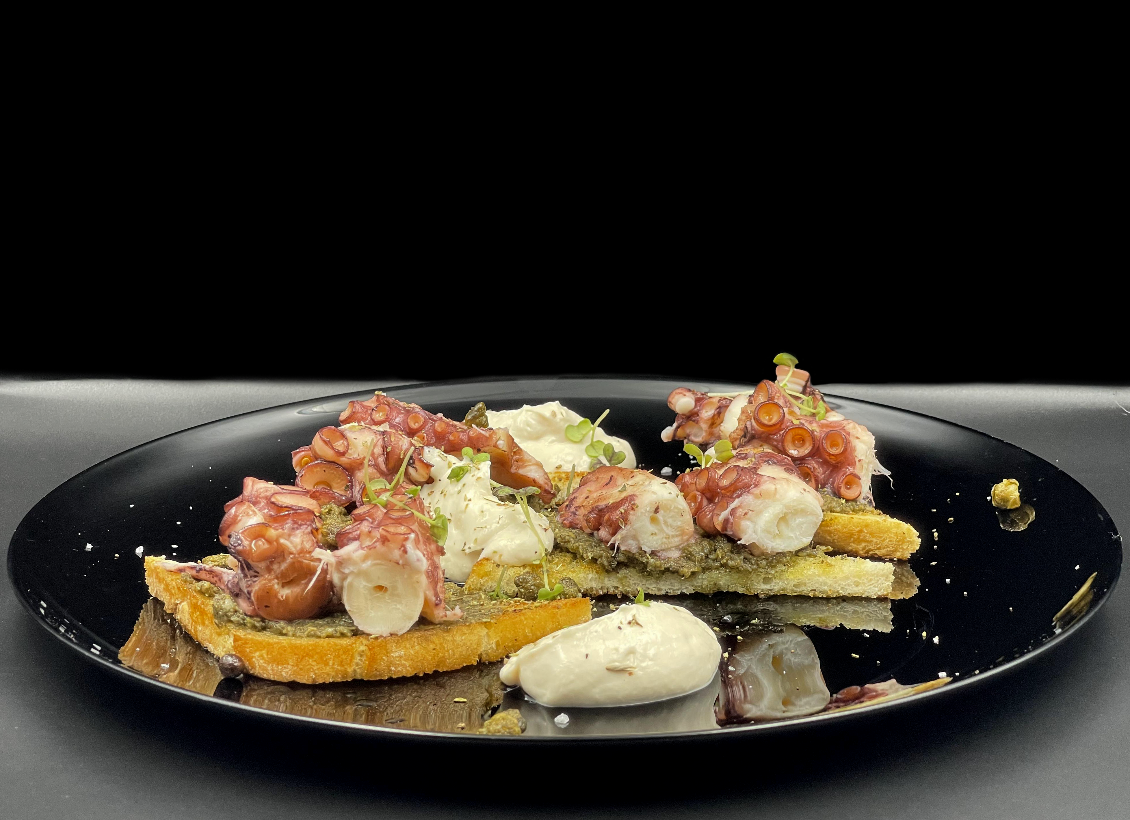 Σε ένα ίσιο πιάτο προσθέτουμε τις μπρουσκέτες αφού τις αλείψουμε πρώτα με ‘’SALSA DI ORTICHE’’ (κρέμα τσουκνίδας), τοποθετούμε από πάνω το χταπόδι κομμένο σε μπουκιές. Σε καυτό τηγάνι προσθέτουμε ελαιόλαδο και κάπαρη και αποσύρουμε από την φωτιά. Αμέσως μετά αφού ανοίξει σαν ανθός, την προσθέτουμε στο πιάτο μας. Κάνουμε κενέλ τον ταραμά, ραντίζουμε με ελαιόλαδο, ανθό αλατιού και φύτρες λαχανικών.