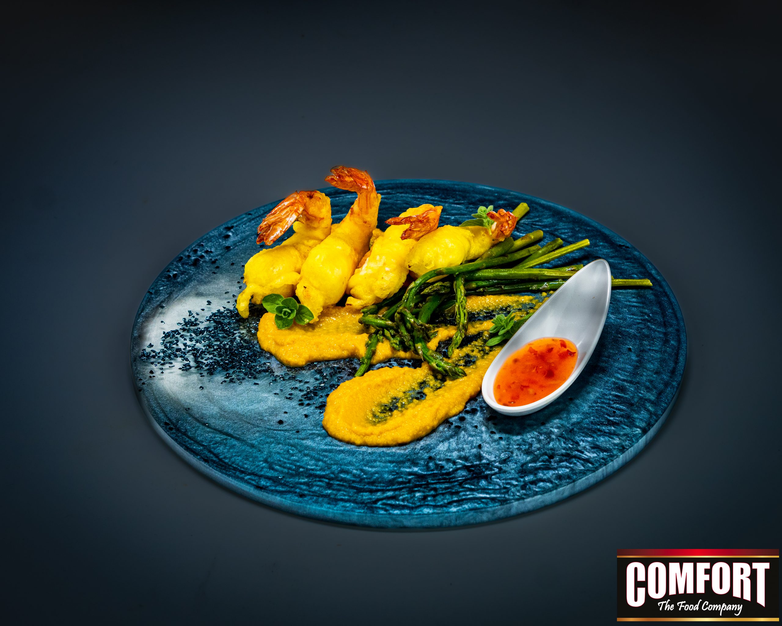 Γαρίδες Tempura με κρέμα γλυκιάς κολοκύθας