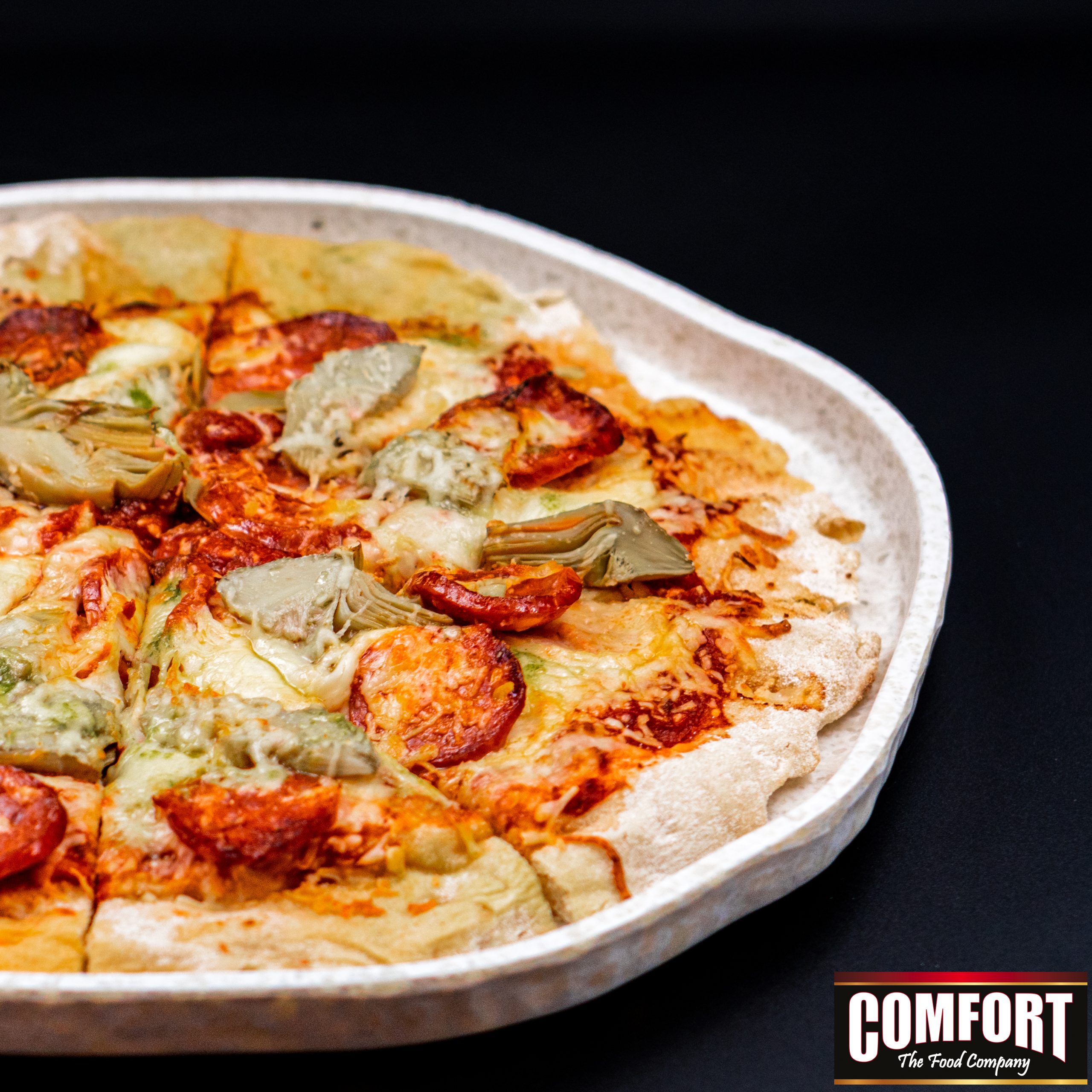 Πάνω στη ζύμη της πίτσας LATONDA προσθέτουμε τη σάλτσα για πίτσα MAZZA, την τριμμένη μοτσαρέλα, το αλλαντικό SALCHICHA BOMBIERI σε ροδέλες, την αγκινάρα σε φέτες MAZZA και την τοποθετούμε στο φούρνο στον αέρα στους 185ο C για 8 λεπτά. Αμέσως μετά την αφαιρούμε από τον φούρνο και σερβίρουμε με λάδι μαϊντανού.