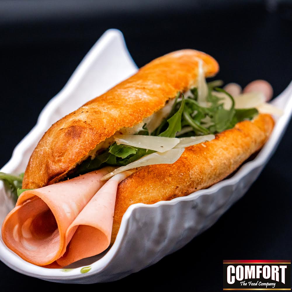 Σε ένα κατσαρολάκι ζεσταίνουμε την κρέμα 5τυριών ALIMENTIS και ύστερα την αλείφουμε στο ψωμάκικαι προσθέτουμε την μορταδέλα φιστικιού, την ρόκα, τολάδι βασιλικού και την πούδρα τρούφας MAZZA.